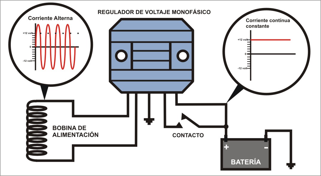 Al girar el volante magnético la bobina genera corriente alterna que es recibida por el regulador. El mismo la rectifica con un puente de onda completa y suministra corriente contínua a la batería.